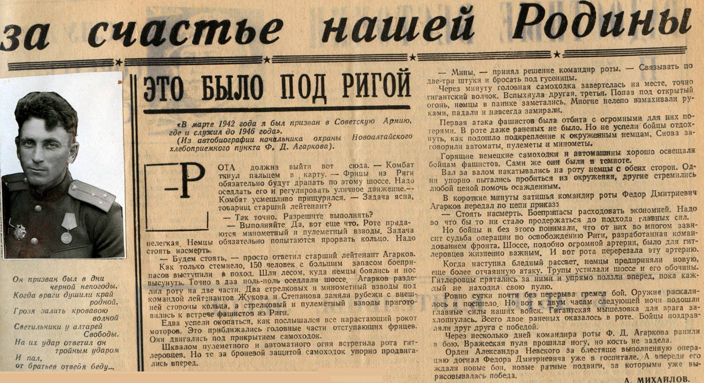 | Агарков Федор Дмитриевич | Младший лейтенант командир стрелкового взвода, лейтенант командир стрелковой роты 450 стрелкового полка 265-ой стрелковой дивизии Родился в 25 февраля 1914 года в д. Ульяновка (с. Ново-Ульяновка) Успенской волости Бийского уезда Томской губернии, ныне Чойский район Республики Алтай В РККА с апреля 1936 года Призван в августе 1942 года Барнаульским РВК Алтайского края Окончил лейтенантские курсы СибВО Член ВКП(б) Награжден медалью За оборону Ленинграда, орденами Красной Звезды 18 июня 1944 года и Александра Невского (23 октября 1944 года, медалью За победу над Германией в Великой Отечественной войне 1941–1945 гг. Окончил службу 11 января 1946 году Статья из газеты Фотографии |