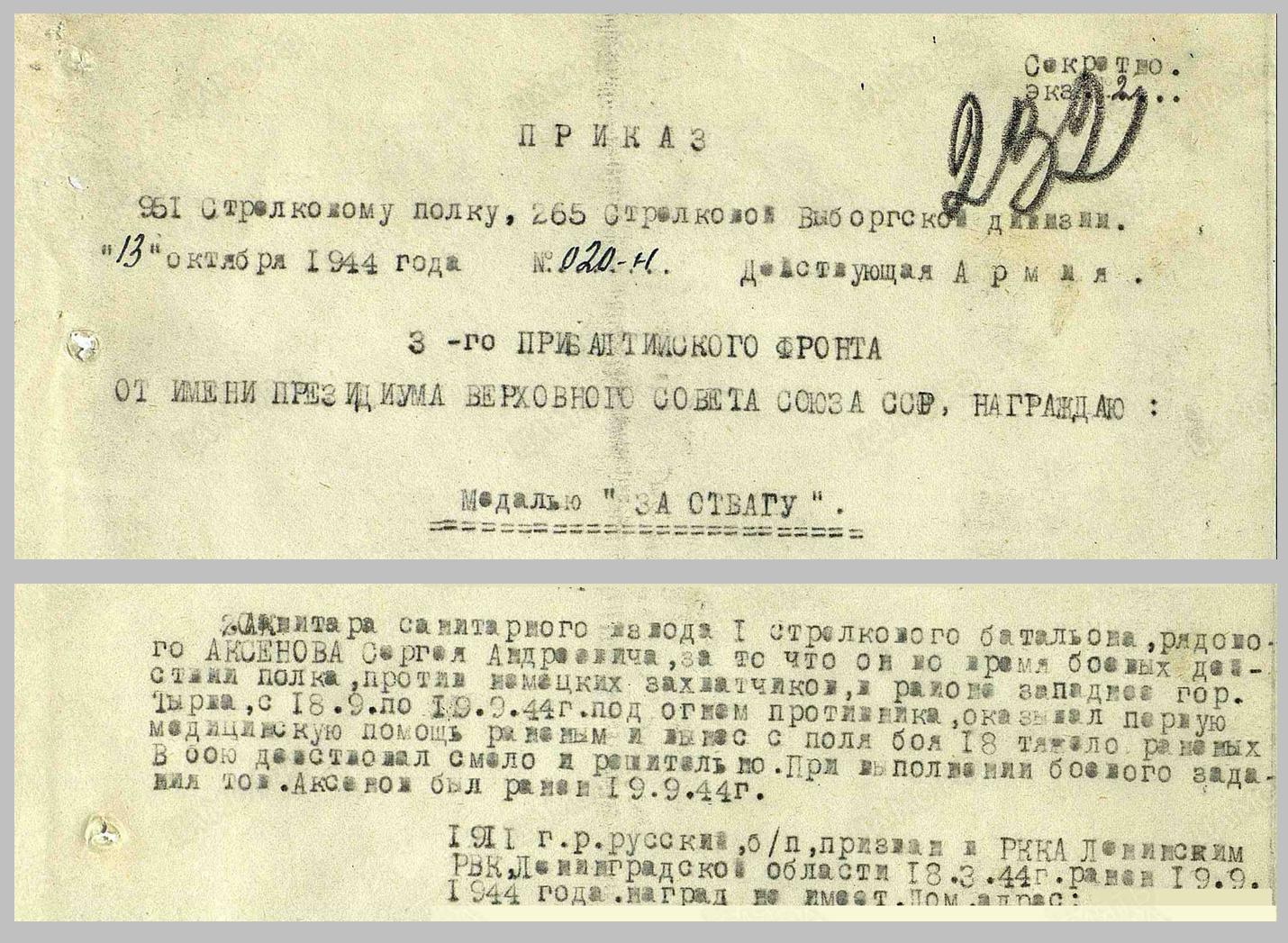 Аксенов Сергей Андреевич | Рядовой, санитар санитарного взвода 1-го стрелкового батальона 951-го стрелкового полка 265-й стрелковой дивизии 1911 г.р. Призван 18.3.1944 года Ленинским РВК (Ленинский район Ленинградской области, ныне Всеволожский район) Награжден медалью "За отвагу" (13.10.1944) |