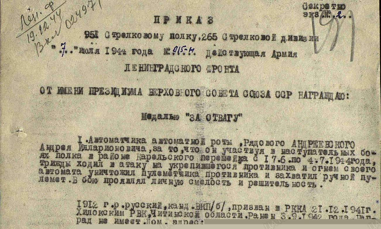 | Андреевский Андрей Илларионович | Рядовой, сержант, старшина, автоматчик автоматной роты 951-го стрелкового полка 265-й стрелковой дивизии Родился в 1912 году в пристанционном поселке Могзон (Могзонский) Хаоцайской волости Верхнеудинского уезда Забайкальской области Призван 21.12.1941 года Хилокским РВК (Хилокский район Читинской области, ныне Забайкальского края) Награжден двумя медалями "За отвагу" (07.07.1944 и 25.09.1944) и медалью "За взятие Берлина" (09.06.1945) |