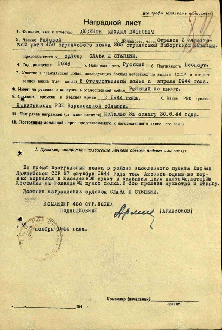 | Аксенов Михаил Петрович | Рядовой (сержант), стрелок 1-ой стрелковой роты (командир отделения 3-го батальона) 450-го стрелкового полка 265-й стрелковой дивизии Родился 3 ноября 1926 года в селе Васильевка Куликовской волости Усманского уезда Тамбовской губернии (ныне Усманский район Липецкой области) Призван в августе 1942 года Дрязгинским РВК Воронежского области Награжден медалью "За оборону Ленинграда" За действия при штурме линии Маннергейма в районе д. Кархула (ныне Дятлово Выборгского района Ленинградской области) награжден медалью "За отвагу" (фрагмент Приказа о награждении) Орденом Славы III степени 5 ноября 1944 года - за действия в районе н.п. Витыни и Видаучи при штурме города Ауце Латвийской ССР Орденом Красной Звезды 29 июня 1945 года - за действия в районе городов Реец (ныне Реч, Польша), Шифельбайн (ныне Свидвин, Польша) в Померании и при штурме Берлина Также награжден медалями "За взятие Варшавы", "За взятие Берлина", "За победу над Германией" После войны с 1948 года жил и работал в Черновцах Молдавской ССР, с 1951 года - в Бугульминском районе Татарской АССР, с 1958 года - в Челябинске |