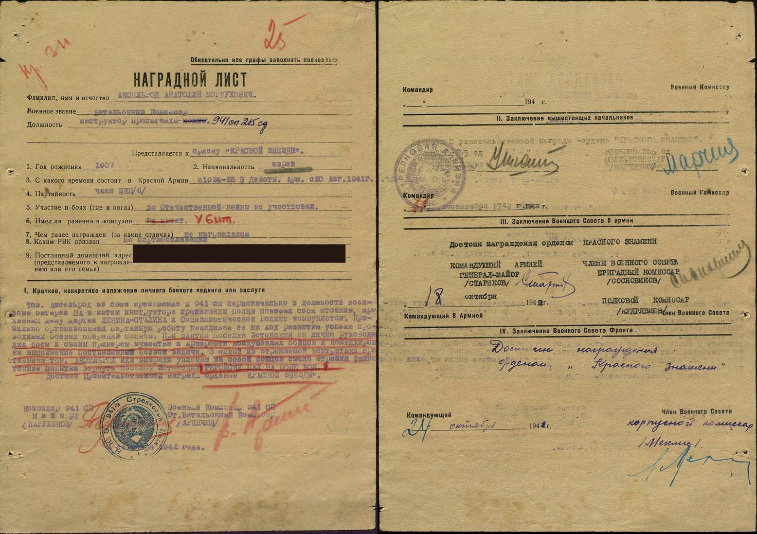| Аксельрод Анатолий Мордухович | Батальонный комиссар, инструктор пропаганды 941-го стрелкового полка 265-й с.д. 1907 г.р. Семья проживала в г. Молотов, ул. Пушкина д. 64 Погиб в бою 29.08.1942 в районе 1-го Эстонского поселка Награжден Орденом «Красное Знамя» (посмертно), Наградной лист (ЦАМО) |