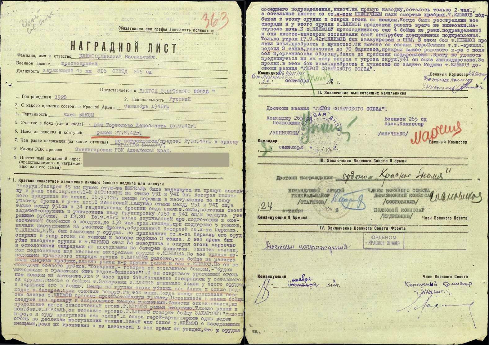| Климов Николай Васильевич | Красноармеец, заряжающий 45мм пушки 316 ОИПТД 265 сд. Награжден в 1942 году Орденом Красного Знамени, наградной лист (ЦАМО) |