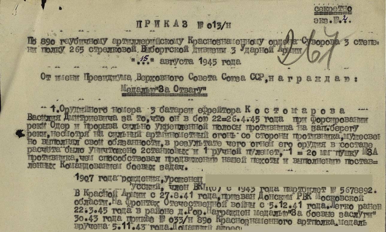 | Костомаров Василий Дмитриевич | Ефрейтор, орудийный номер 3-й батареи 890-го гаубичного артиллерийского полка 265-й стрелковой дивизии. Родился в 1907 году. Призван Донским РВК. В РККА с 27.8.41.Член ВКП(б). Награжден медалью «За боевые заслуги». За действия при форсировании реки и прорыве сильно укрепленной полосы противника на западном берегу Одера награжден медалью «За Отвагу» |