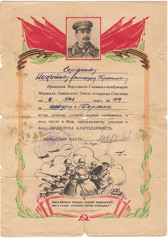 | Никитин Александр Герасимович | сержант (удостоверение к медали «За оборону Ленинграда», Грамота за штурм Берлина, фрагмент биографии) |