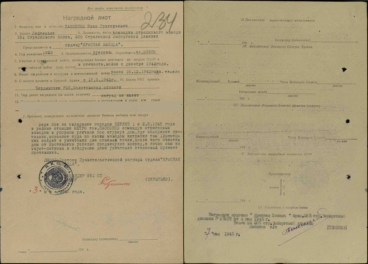 | Нассонов Иван Григорьевич | Лейтенант, командир стрелкового взвода 951-го стрелкового полка 265-й стрелковой дивизии 1923 г.р. В РККА с 15.05.1942 года Призван Чердынским РВК Молотовской области Награжден орденом Красной Звезды за действия в ходе уличных боев в Берлине 1.05.-2.05.1945 |