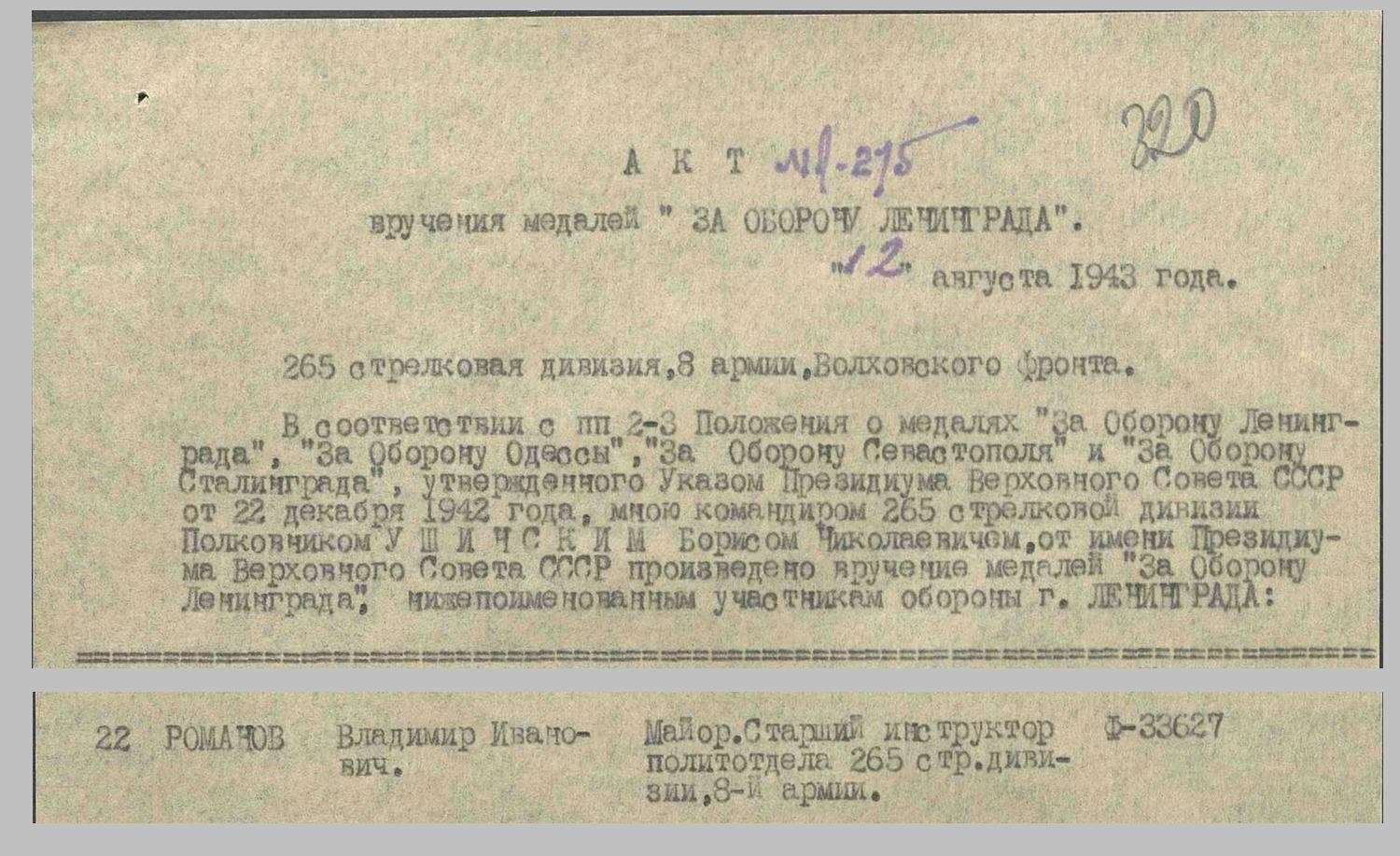 | Романов Николай Васильевич | Красноармеец, сапер 429 Отдельного Саперного батальона 265 сд. В 1942 году представлен к Ордену Красного Знамени, наградной лист (ЦАМО) |