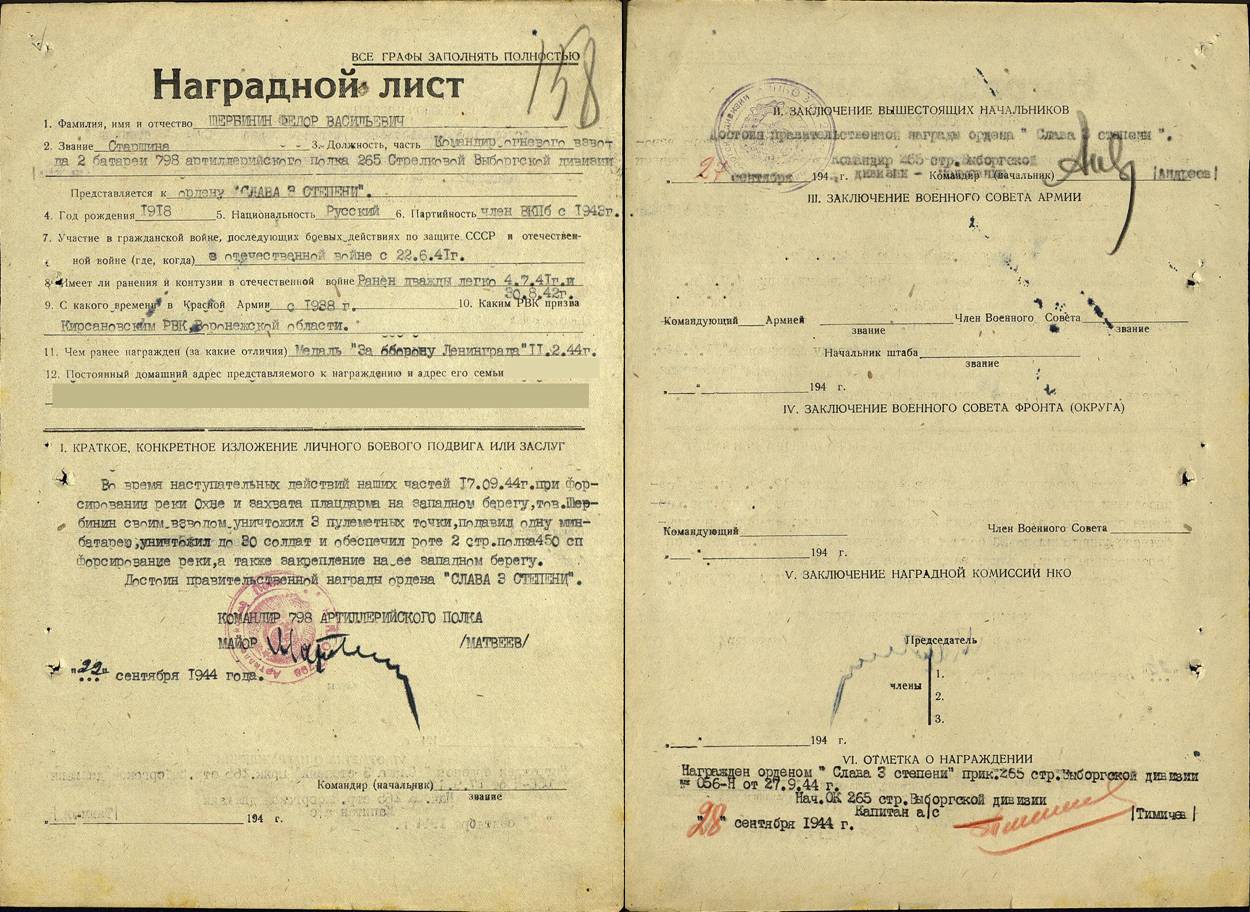 | Щербинин Федор Васильевич | Старшина, командир огневого взвода 2-й батареи 798 а.п. 265 с.д. Награжден медалью «За оборону Ленинграда» и орденом «Слава 3 степени» (за бои под городом Тырва, наградной лист, ЦАМО) |