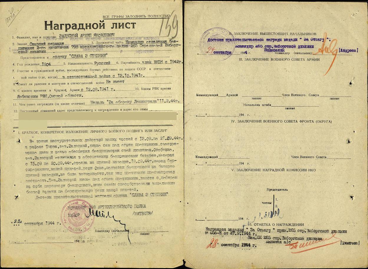 | Залесный Архип Яковлевич | Старший сержант, командир отделения боепитания 2-го дивизиона 798 а.п. 265 с.д. Награжден медалью «За оборону Ленинграда» и орденом «Слава 3 степени» (за бои под городом Тырва, наградной лист, ЦАМО) |