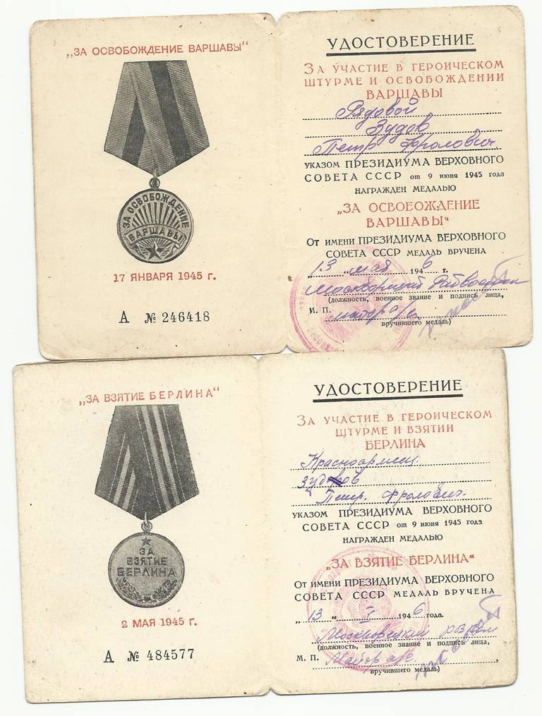 | Зудов Петр Фролович | Красноармеец, орудийный номер 798-го артиллерийского полка 265-й стрелковой дивизии. 1913 г.р. Был призван в июне 1941 Москворецким РВК (г. Москва) Награжден медалью «За Оборону Ленинграда», медалью «За боевые заслуги», медалью «За Отвагу», медалью «За освобождение Варшавы», медалью «За взятие Берлина» и орденом «Красная Звезда». Фотография 1, 2, 3, 4 Благодарность за участие в штурме Берлина, Статья в газете (1975 г.), Фотография 5 |